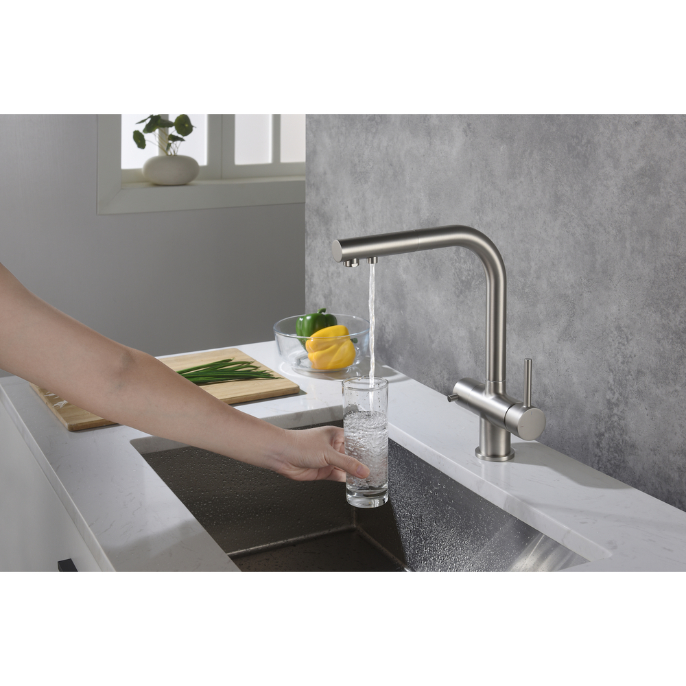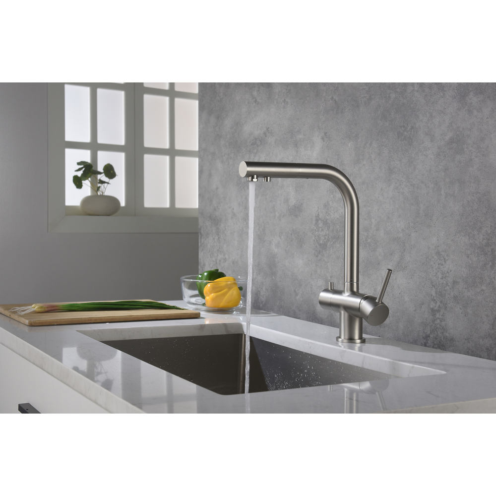 Цвет "матовый никель" является новым фаворитом для многих дизайнеров интерьеров. Этот цвет универсален, подходит практически для любой ванной комнаты или кухни.Смеситель Timo Saona 2356 с выдвижной лейкой и системой подключения фильтрованной воды относится к премиальному сегменту, предназначен для монтажа на кухонную мойку или столешницу. Высокий излив подходит для моек с двумя чашами, а также позволяет справляться с мытьем габаритной посуды. Удобное (вертикальное) расположение рычага смесителя в крайнем положении "холодный старт", позволяет не задевать ручкой за стеновые панели, фартук, предметы, которые находятся за смесителем. Картридж с функцией "холодный старт" работает в диапазоне 90 градусов, рычаг установленный в исходное положение (вертикально) при открытии подает только холодную воду, а не 50% холодной воды плюс 50% горячей, позволяя экономить до 30% расход горячей воды. Для подачи горячей воды необходимо повернуть рычаг на себя. Выдвижная лейка с прочным шлангом длинной 400мм облегчает мытье раковины, крупной посуды, позволяет набрать воду в емкость, стоящую рядом с мойкой. Встроенный магнитный держать позволяет легко вернуть лейку в исходное положение. В нижней части смесителя установлена трубка с адаптером для соединения с трубкой фильтра. Подача фильтрованной воды осуществляется поворотом ручки дивертора расположенной слева на корпусе смесителя. Сложностей монтажа не возникает при установке смесителя опытным сантехником. Внимательно изучите инструкцию по монтажу и эксплуатации.Цвет "матовый никель" прост в уходе, не оставляет отпечатков пальцев и разводы от воды.