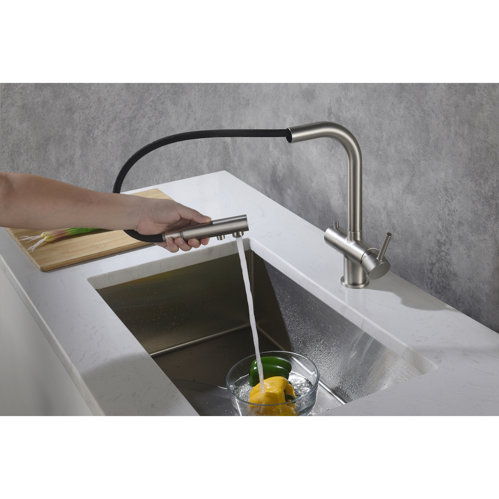 Цвет "матовый никель" является новым фаворитом для многих дизайнеров интерьеров. Этот цвет универсален, подходит практически для любой ванной комнаты или кухни.Смеситель Timo Saona 2356 с выдвижной лейкой и системой подключения фильтрованной воды относится к премиальному сегменту, предназначен для монтажа на кухонную мойку или столешницу. Высокий излив подходит для моек с двумя чашами, а также позволяет справляться с мытьем габаритной посуды. Удобное (вертикальное) расположение рычага смесителя в крайнем положении "холодный старт", позволяет не задевать ручкой за стеновые панели, фартук, предметы, которые находятся за смесителем. Картридж с функцией "холодный старт" работает в диапазоне 90 градусов, рычаг установленный в исходное положение (вертикально) при открытии подает только холодную воду, а не 50% холодной воды плюс 50% горячей, позволяя экономить до 30% расход горячей воды. Для подачи горячей воды необходимо повернуть рычаг на себя. Выдвижная лейка с прочным шлангом длинной 400мм облегчает мытье раковины, крупной посуды, позволяет набрать воду в емкость, стоящую рядом с мойкой. Встроенный магнитный держать позволяет легко вернуть лейку в исходное положение. В нижней части смесителя установлена трубка с адаптером для соединения с трубкой фильтра. Подача фильтрованной воды осуществляется поворотом ручки дивертора расположенной слева на корпусе смесителя. Сложностей монтажа не возникает при установке смесителя опытным сантехником. Внимательно изучите инструкцию по монтажу и эксплуатации.Цвет "матовый никель" прост в уходе, не оставляет отпечатков пальцев и разводы от воды.